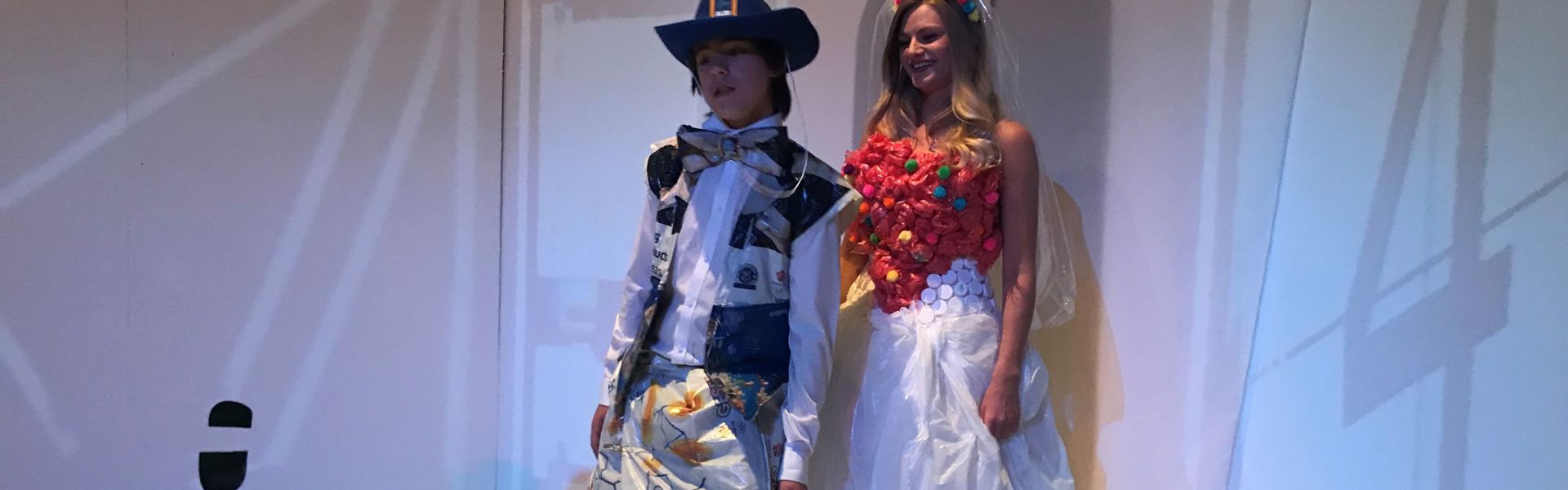‘Junk 2 Funk’ focused on repurposing conventional, everyday waste items into fun, silly and enjoyable art pieces. Dresses fashioned out of supermarket carrier bags, astro-turf hats, a wedding dress with a corset of bottle tops, a newspaper kilt, with matching sporran, a flattened drink can dress were some of the firm favourites, but the pièce de resistance was the full Scottish highland dress replicated in Aldi bags!